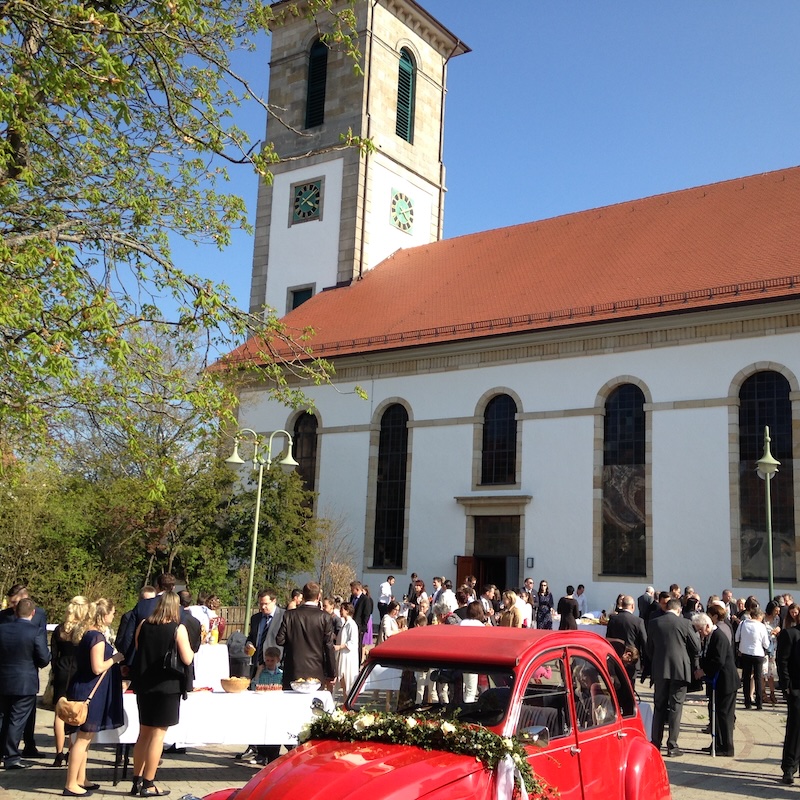 Der großzügige Brunnenplatz direkt vor dem Gebäude. Er lädt zur Begegnung ein, vor und nach dem Gottesdienst. Hier können Feste und auch Open-Air-Gottesdienste gefeiert werden. Und etwa alle 6 Wochen beginnen unsere Gottesdienste mit einem „Auftakt im Kreis“: