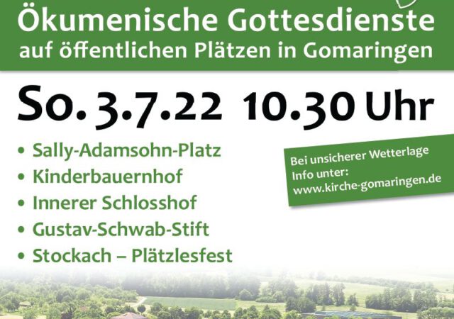 Kinderbauernhof mit evangelischen Taufen (Pfr. Rostan, Band Index) Sally-Adamson-Platz (Pfr. iR. Renovanz-Grützmacher) Gustav-Schwab-Stift vor Ilse-Graulich-Haus (Pastorin Obergfell) Innerer Schlosshof (Gemeindereferentin Bohnenberger) Stockach, CVJM-Plätzle (Pfr. Dinkel). Anschließend Möglichkeit zum Mittagessen am Grill. Grillgut bitte mitbringen, für Getränke ist gesorgt. KEIN Kindi-Gottesdienst…