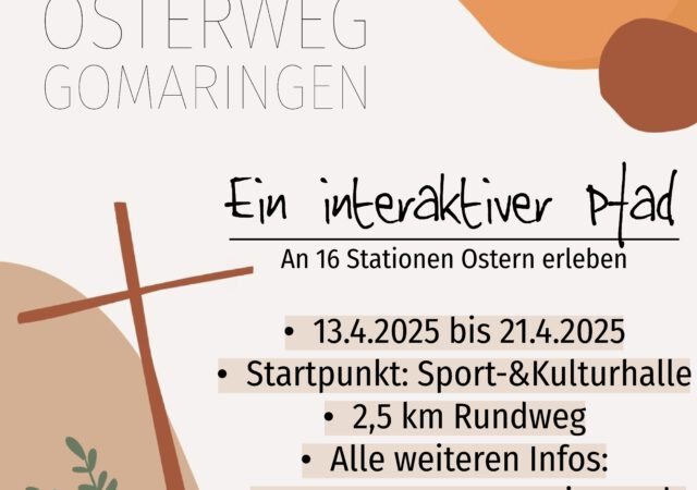 Wir laden euch herzlich ein, die bewegende Passionsgeschichte von Jesus Christus auf eine ganz besondere Weise zu erleben. Der Osterweg in Gomaringen führt anhand von 16 interaktiven Stationen, die im Freien aufgebaut sind, von der Sport- und Kulturhalle zum Ortskern…