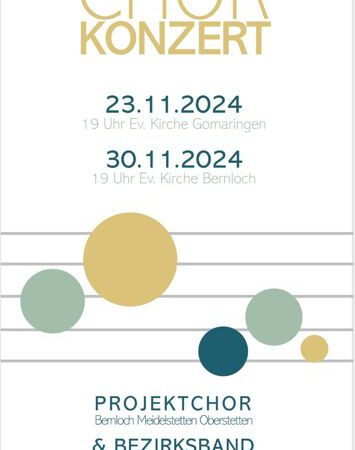 Der Projektchor Bernloch, Meidelstetten und Oberstetten kommt zusammen mit der Bezirksband Bad-Urach, Münsingen nach Gomaringen. Herzliche Einladung am 23. November um 19 Uhr in die evangelische Kirche. Der Eintritt ist frei, um Spenden wird gebeten.