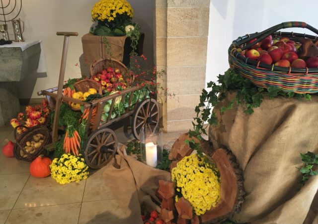 Auch in diesem Jahr gab es begeisterte Reaktionen auf unseren außergewöhnlich schönen Erntedankschmuck. Wieder gab es, neben dem zugleich vielfältig und ästhetisch gestalteten Altarraum mehrere „Seitenaltäre“ mit Thementischen der Dankbarkeit: vom Mehl bis zur Kürbiswelt, von der Marmelade bis zum…