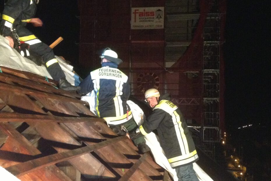 Erst die Sturmböen, dann der Wolkenbruch – das Ergebnis war am Sonntagabend ein hässlicher Wassereinbruch in die Kirche. Großflächig tropfte das Nass durch die Decke… Wenn’s durch die Decke tropft