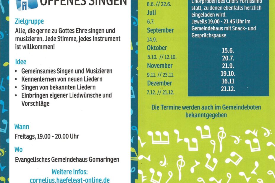 Das offene Singen im Gemeindehaus geht in eine neue Runde. Auch 2019 wird unter Leitung von Gabriele und Cornelius Haefele circa eine Stunde miteinander gesungen… Offenes Singen künftig mittwochs