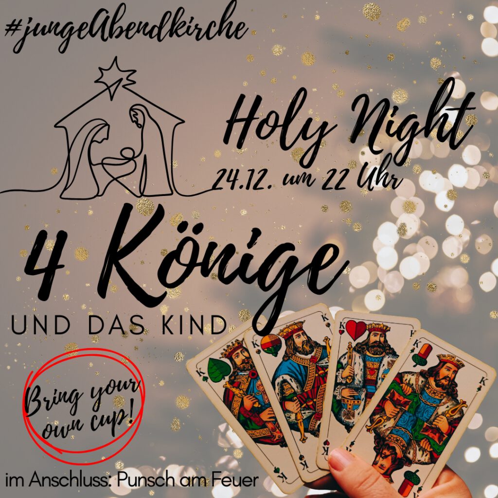 Herzliche Einladung zum Holy Night Gottesdienst am 24. Dezember um 22 Uhr. Mit einer Predigt von Pfarrer Hartmut Dinkel zu dem Thema „4 Könige und das Kind“. Anschließend gibt es Punsch und Feuer und ganz viel Schwätzen…