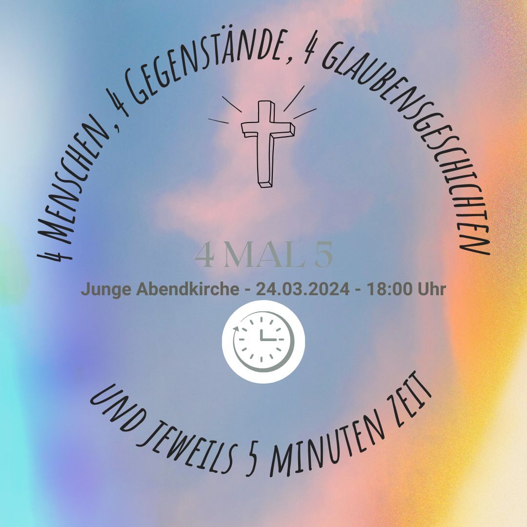„4 Menschen, 4 Gegenstände, 4 Glaubensgeschichten“. Vier Personen aus der Gemeinde bringen einen Gegenstand mit und erzählen uns, was dieser mit ihrem Glauben zu tun hat. Sonntag, 24.3. um 18 Uhr.