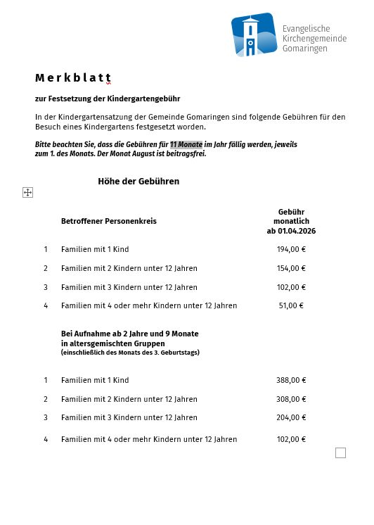 Gemäß eines Grundsatzbeschlusses des Kirchengemeinderates folgen wir jeweils exakt der Gomaringer Gebührenordnung für den Kindergarten. Der Gemeinderat Gomaringen hat zum 1.4.2026 neue Beiträge beschlossen: