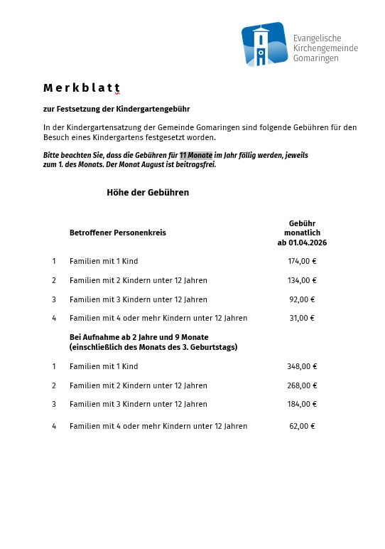 Gemäß eines Grundsatzbeschlusses des Kirchengemeinderates folgen wir jeweils exakt der Gomaringer Gebührenordnung für den Kindergarten. Der Gemeinderat Gomaringen hat zum 1.4.2026 neue Beiträge beschlossen: