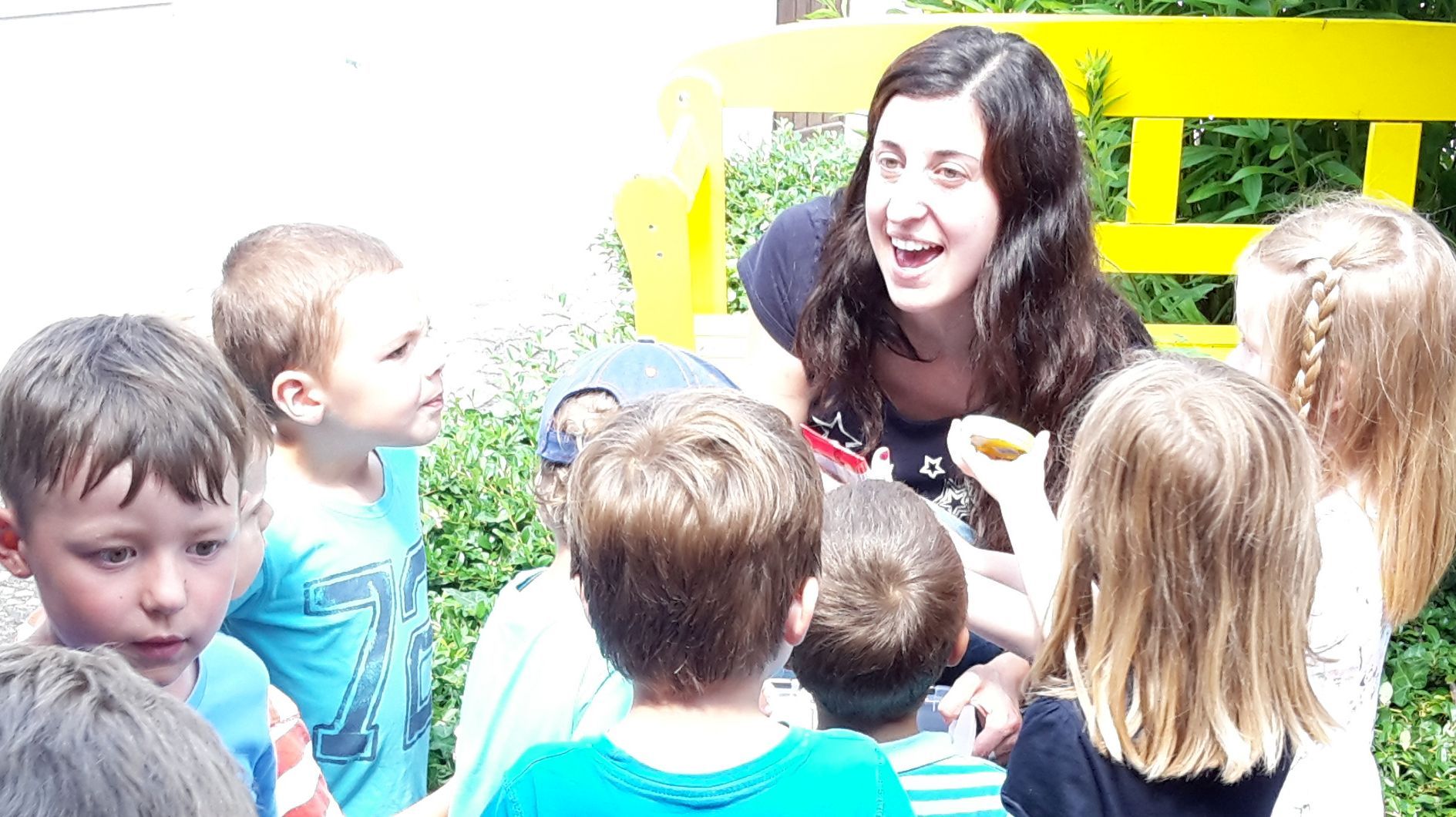 Diesmal durfte ausnahmsweise die Chefin persönlich auf der gelben Ehrenbank Platz nehmen. Miriam Leibßle wurde nach inzwischen 13 Dienstjahren aus dem Kindergarten verabschiedet. Schon das Vorpraktikum hatte sie dort im Kindergartenjahr 2000/01 absolviert. Nach erfolgreicher Ausbildung wurde sie zunächst Gruppenleiterin, später übernahm sie die Gesamtleitung des Hauses in der Roßbergstraße.