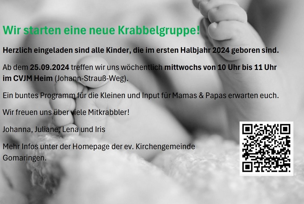 HomeGemeindelebenKinder und JugendlicheKrabbelgruppenNeue Krabbelguppe ab 25. September Krabbelgruppen Neue Krabbelguppe ab 25. September Eva Wittermann frühere Beiträge16. August ab 19 Uhr "Wein und Käse" neuere BeiträgeKinderbibeltage: Einladung zur Mitarbeit 23. Juli 2024