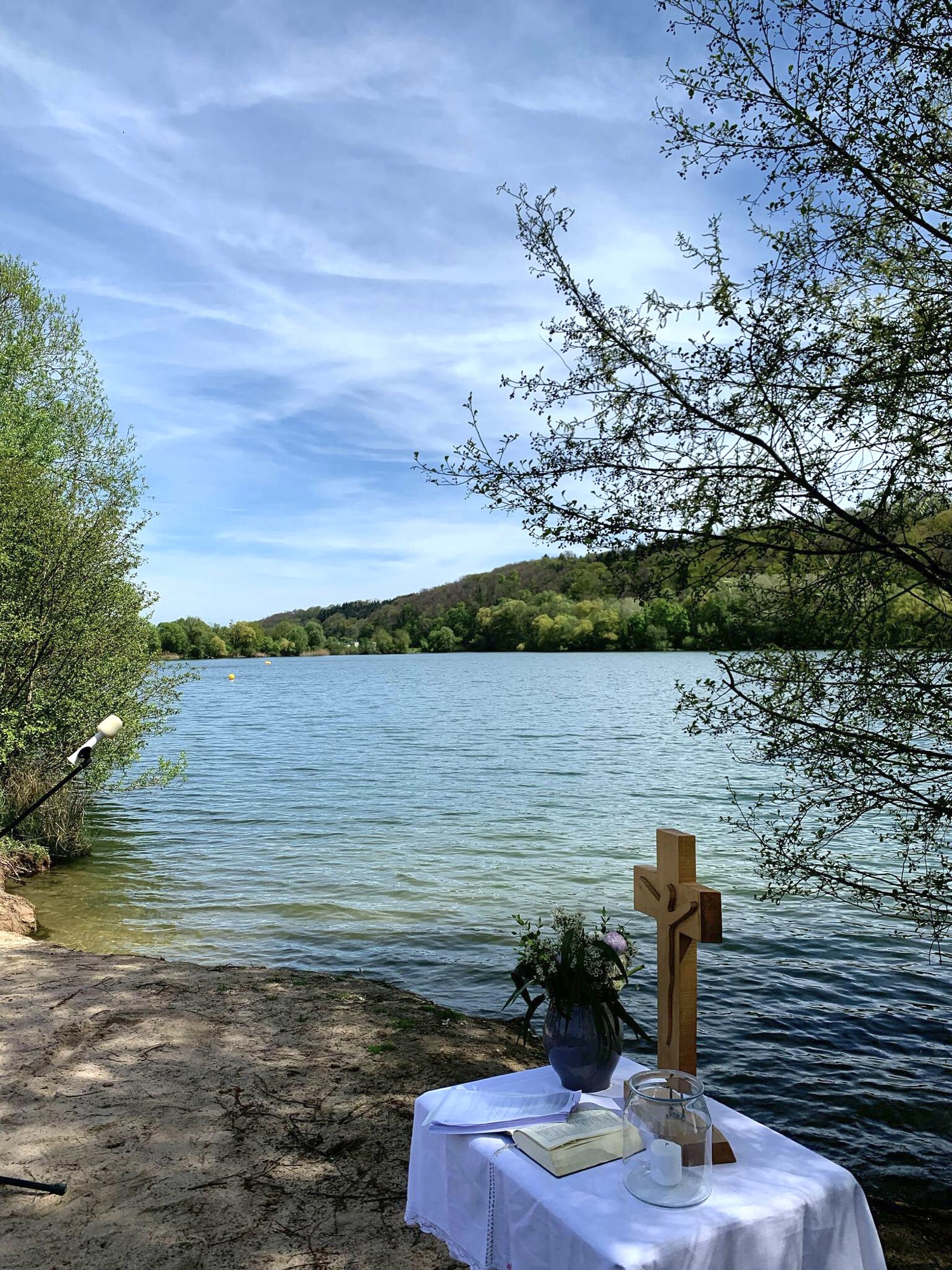 Das gibt‘s am Baggersee Kirchentellinsfurt bestimmt nicht oft zu sehen: Ein Pfarrer im Bademantel und eine Gemeinde in Campingstühlen und Sonnenbrillen. Der Grund?